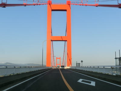 | 岩の上大橋交差点を左折すると岩の上大橋交差点を渡るが、直線ながらかなりの急勾配である。前述の通り、平戸大橋が本土の唯一の橋とあって岩の上大橋交差点を右折する車両で長い車列ができていた。岩の上大橋を渡り終えてからも上り勾配が続いているが、徐々に勾配は緩やかになる。岩の上大橋交差点から約900m走ると上大垣交差点を通過するが、ここで現道が合流してくる。現道は平戸市の市街地を通り抜けており、距離は3.5kmとバイパスに比べて4倍近く長い。上大垣交差点から岩の上大橋交差点に向かって走行したレポートは別ページで作成している。 | ||