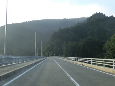 | 東脊振トンネルを目の前に見ながら信号のない交差点を左折するとすぐに大野大橋を渡る。現道とは思えないほど高い位置を走る長大な橋だが、もちろん五ヶ山ダムの建設に伴って建設されたもので本来のR385現道ではない。大野大橋の下を流れている大野川も県境となっているため、橋を渡ると福岡県那珂川町に戻る。 大野大橋を渡り終えた西詰で一つの車線をふさぐ形でガードレールが置かれており、「全面通行止」と書かれた看板が立てかけられている。本来の現道は直進なのだが、ダム建設に伴う付替え道路(町道)の建設に伴って通行できない。南畑ダム南端の交差点で現道に進めばここに至るのだが、物理的に走行できなくなっている。ダム湖に沈む現道にして付替え町道との交差点を右折すると坂本峠区間に入る。道路情報板には走行に注意しかつスリップに注意するようにと表記されているが、通行止とはなっていない。 |