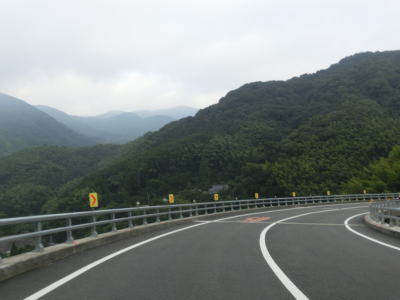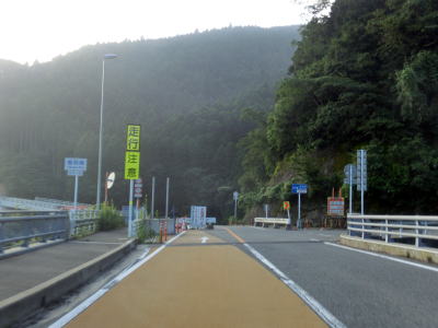| 大野大橋の西詰の交差点(予定)を右折した直後こそはっきりとセンターラインが引かれた2車線道路だったが、すぐにセンターラインがなくなり1.8車線幅になってしまう。しかしその距離は短くすぐにキャッツアイ付きのセンターラインが復活する。車線逸脱を防止するためのキャッツアイだろうが、カーブ部分だけでなく直線部分にも設置されている。 ヘアピンカーブを2ヶ所通過しているがそこ以外の勾配は緩やかである。県境の尾根の下を走っていると佐賀県公安委員会が設置した標識が目に入る。曰く、「この先幅員減少 積2t以上通行禁止」と。2t以上通行禁止というとあの国道が通っている峠を思い浮かべるが、あちらはトンネル主体のバイパスが開通した事により国道の指定を外れたうえに長期にわたって災害通行止が続いている。 |