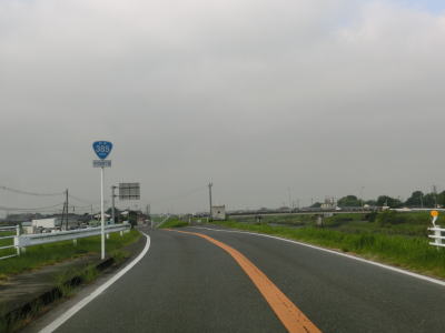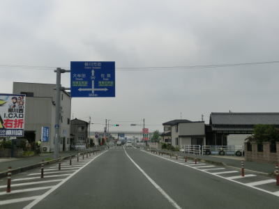 | 三百交差点からは消えかけているとは言え2車線の直線道路を走る。約600m南下した所でセンターラインがなくなりいきなり1.0車線にまで狭くなり大橋を渡る。橋を渡って以降も1.0車線狭路が続いており、対向車との離合は人様の家の敷地にタイヤを入れなければままならない。三橋大川バイパスが並走しているのだが、一部が開通していないため現道の交通量が多いので厄介である。 | ||