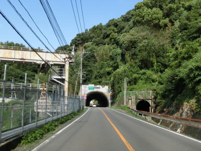 | 夜明ダムの直後に新櫛崎トンネルをくぐる。右側に見えるのはJR久大本線である。川寄りには櫛崎隧道があるが閉鎖されており通り抜ける事ができない。にもかかわらずウォッちずでは国道色に塗られたままである。新櫛崎トンネルを出ると右にカーブした後に久大本線をオーバーパスする。 | ||