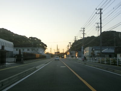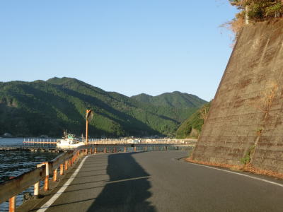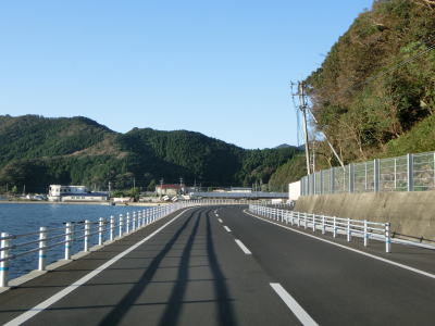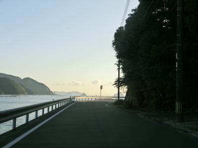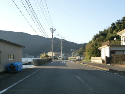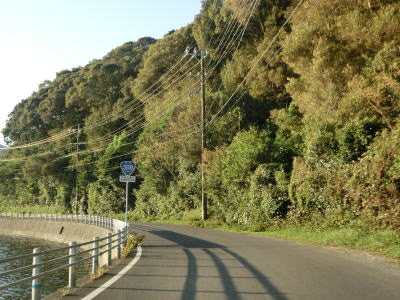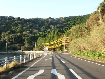 | 楠本湾の南側も海に沿ったカーブの多い狭路が続いている。正金川を渡ると沿線の家屋が途切れ、楠本湾から河内湾沿いとなる。海岸線が入り組んでおり複数の小さな湾が別れている。湾の出入口が狭いためか、海面は非常に穏やかである。 | ||
