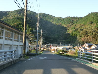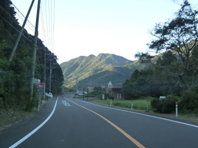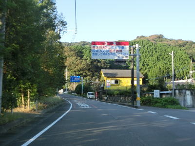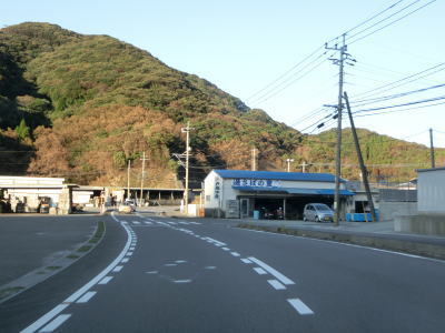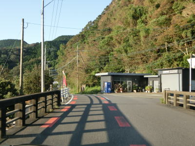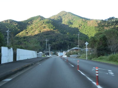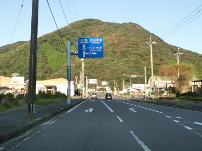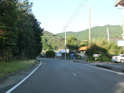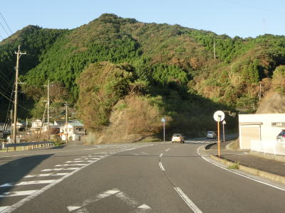 | 名護屋崎の根元を越田尾トンネルで通過する。丸市尾浦集落に入る手前の右側に人口の高台が見えるが、これは津波避難所である。避難所と言っても上部に建物がある訳ではなく、あくまで津波発生時にとりあえず逃げるための施設である。丸市尾浦集落は海沿いを走っているが防風林に視界を遮られており海は見えない。 | ||