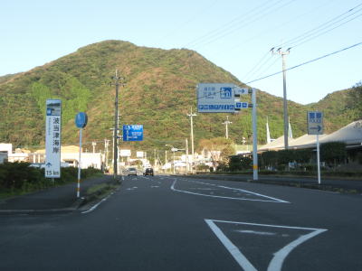 | 小浦ヶ浜トンネルを出た先で旧道との交差点を通過して海沿いを走る。が、すぐに幅員減少の警告が現れて車線が丸ごとなくなって1.5車線幅にまで狭くなってしまう。入津トンネルから小浦ヶ浜トンネルにかけての旧道も1.5車線幅と広くない。 | ||