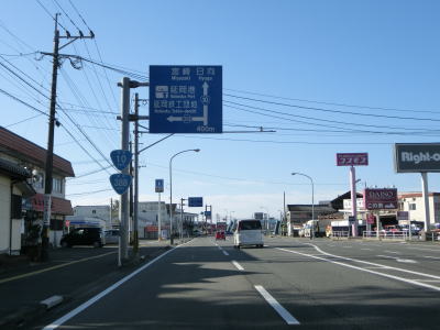 | 延岡駅の南東でR10・R218・R326昭和町交差点を直進する。R326の起点はこの交差点のため3国道重複区間が終わる。R218はこの交差点が終点であり、起点は熊本市にあり九州を横断している。 昭和町交差点からもR10との重複区間が続いており、交通量の多い片側2車線道路を走る。延岡大橋で五ヶ瀬川と大瀬川を渡って以降も郊外型の商業施設の多いバイパス然とした状態を走る。 |