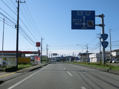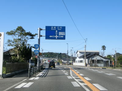 | 126.JR日豊本線と並走 | 127.宮崎r49・r224土々呂町交差点 | 128.「宮崎77km 日向12km E10東九州道3km」 |