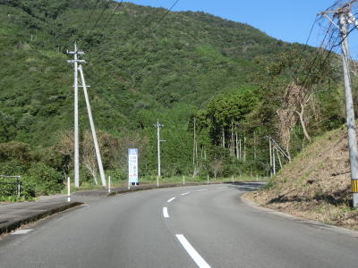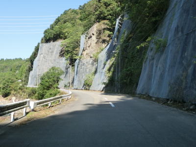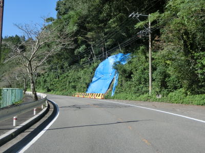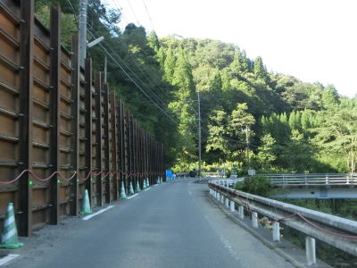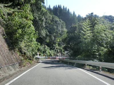 | 板ヶ原集落を通り過ぎると1.8車線幅区間となるが、工事のため片側交互通行規制が敷かれていた。その後も1.8車線幅道路が続いているが、公衆トイレと東屋のある道の泉北郷を過ぎると1.5車線とさらに狭くなる。その後はセンターライン付きの2車線道路になるが、災害復旧工事により車線がふさがれており片側交互通行規制が敷かれている区間があった。 | ||