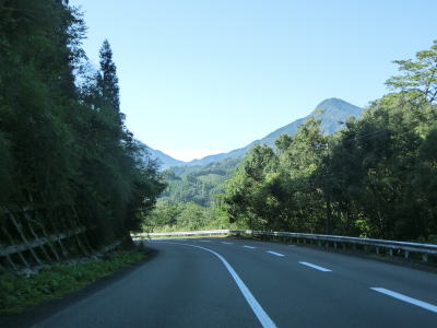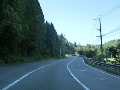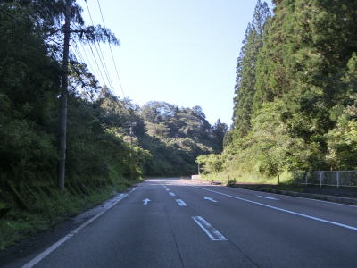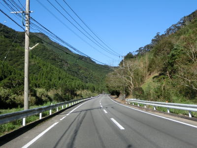 | 中須交差点から約11.8km走るとセンターラインがなくなり道幅も狭くなる。1.8車線幅だったものが徐々に狭い区間の割合が増えて1.5車線幅に落ち着いてしまう。道幅は狭くなってしまったが、勾配も急カーブもほとんどなく路面も安定している。大分県と宮崎県の県境区間に比べると格段に走りやすいと感じる。 | ||