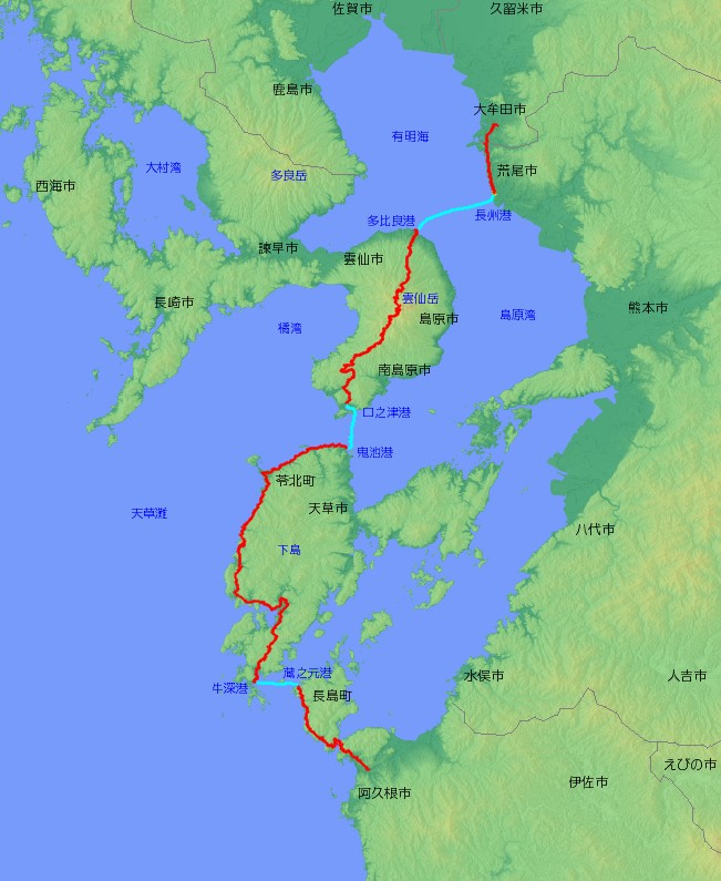 | 海上区間 | 熊本県長洲町(長洲港)…長崎県雲仙市(多比良港) 長崎県南島原市(口之津港)…熊本県天草市(鬼池港) 熊本県天草市(牛深港)…鹿児島県長島町(蔵之元港) |