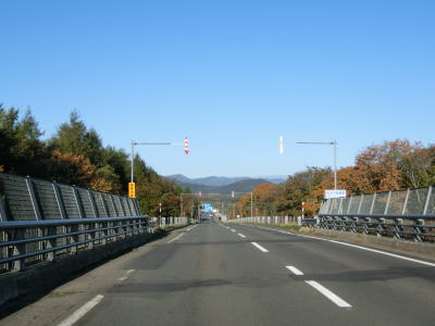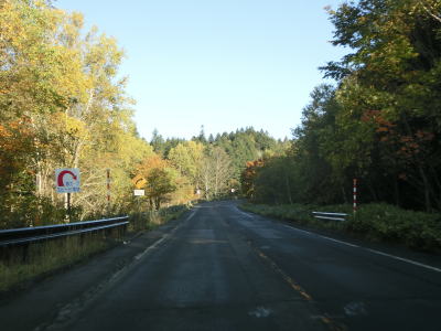 | 北海道r102交差点からは上り勾配となり、程なくして閉鎖用のゲートを通過する。その手前では転回も可能な駐車場(チェーン着脱場)が設置されている。ゲートを越えて規制区間に入っても緩やかな勾配と緩やかなカーブの走りやすい2車線道路が続いている。 | ||