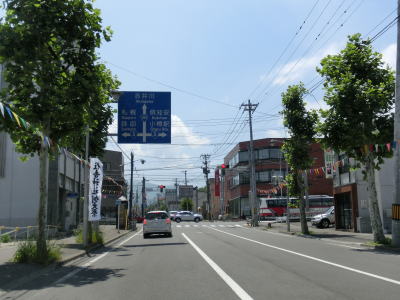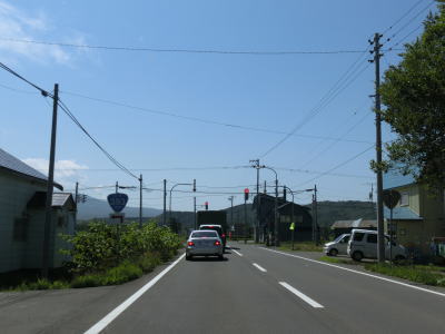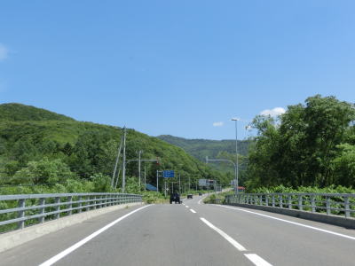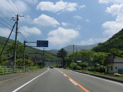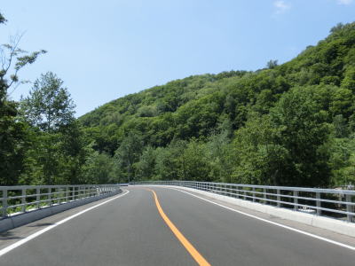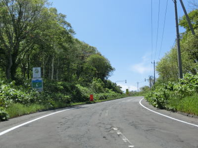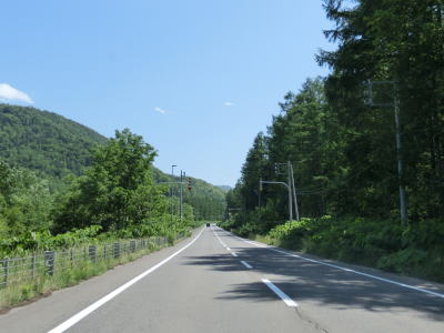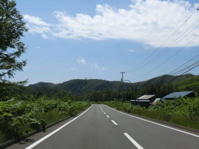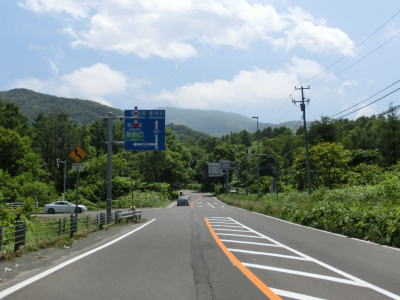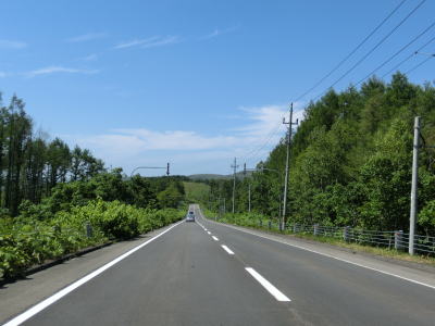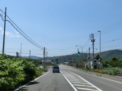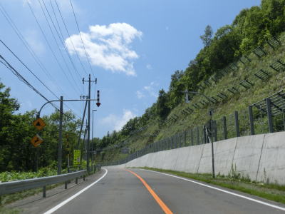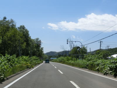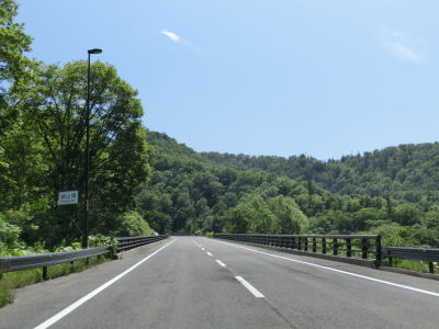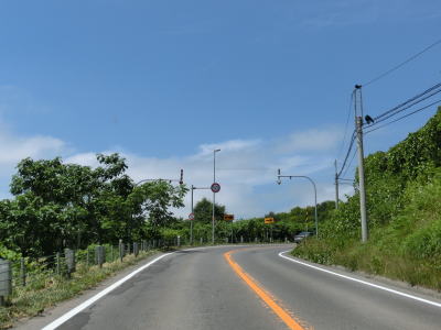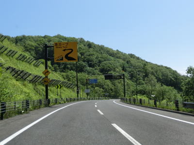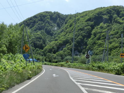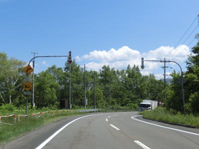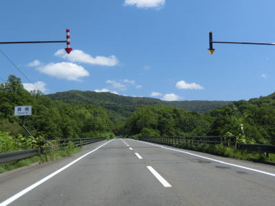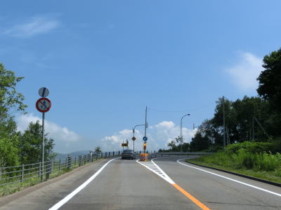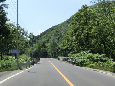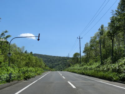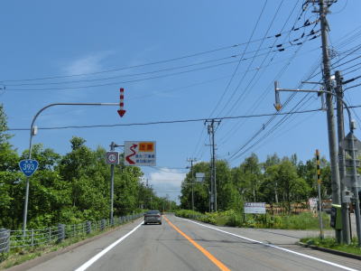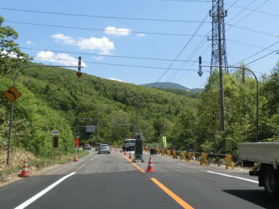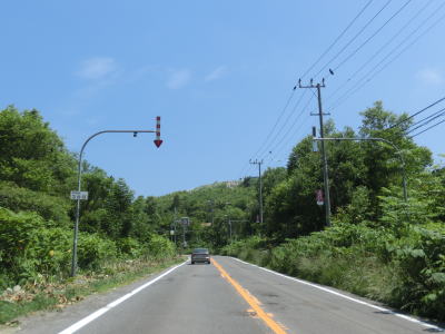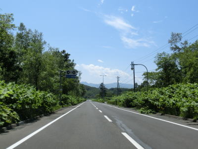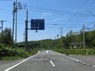 | 赤井川村に入り緩やかな下り勾配の快走路を走っていると最初の急なカーブから先は工事のため片側交互通行規制が敷かれていた。工事区間を通り過ぎると緩やかな下り勾配の2車線道路が続いている。小樽市でヘアピンカーブが連続していたのが信じられない程の走りやすい道路状況である。毛無峠から約5.8kmで赤井川高原道路との交差点を通過する。高原道路の案内先はキロロとなっているが、これはスキー場を中心としたレジャー施設で、夏期はスキーこそできないもののそれ以外の施設もあるためこの日も多くの車両が左折していった。 | ||