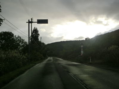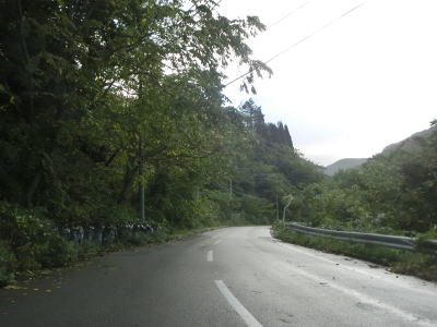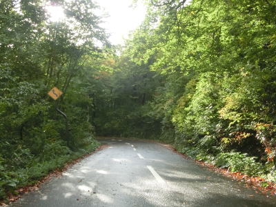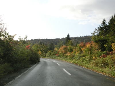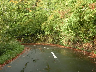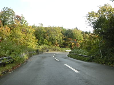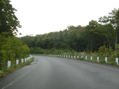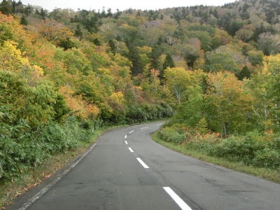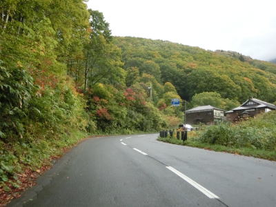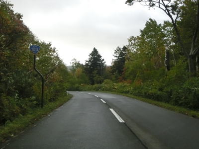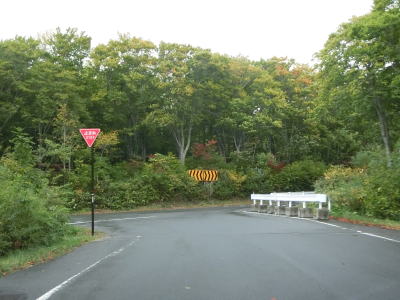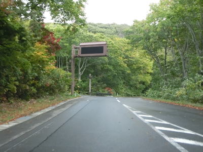 | 冬季閉鎖区間に入ってからもセンターライン付きの2車線道路が続いている。急なカーブが少ないため酸ヶ湯温泉内よりも走りやすく感じる。標高1000m辺りからは周囲の木々が色付き始めるのを確認できる。走行した日は10月9日である。緩やかな勾配を上っていると傘松峠を越えて十和田市に入る。 | ||