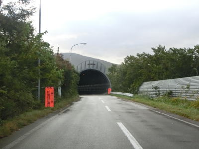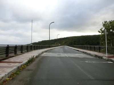 | 無名のスノーシェルターを出た直後に市境を通過して青森市に入る。スノーシェルターをと市境標識の間の北西方向に青森r226が伸びているはずだが、ウォッちずには徒歩道として描かれているものの通り過ぎざまに見ただけでは道路らしきものは確認できなかった。 眺望は良くないが開けた場所を走っていると城ヶ倉スノーシェルターををくぐる。連続するカーブを曲がった後に城ヶ倉大橋を渡る。橋上からの眺めが良いビューポイントとなっており、橋の両端にはそれぞれ公衆トイレのある簡易パーキングが設置されている。南側のパーキングには大型車用のスペースも用意されている。 |