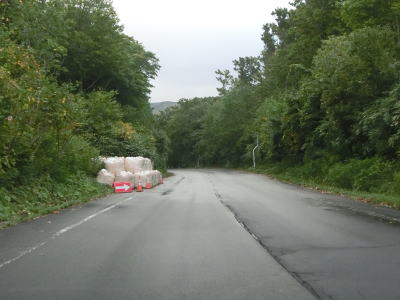 | 43.比較的新しい巨大土嚢も見られる | 44.交通量は非常に少ない | 45.R103城ヶ倉交差点を右折 |