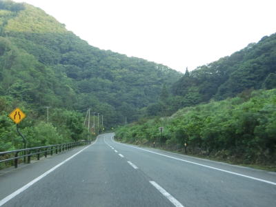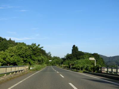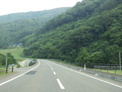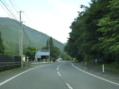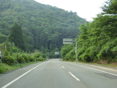 | 子飼沢トンネルを出て閉鎖されている旧道との交差点を過ぎると幅員が減少する。と言っても路肩が狭くなるだけで2車線道路という点に変化はない。大股川に沿っておりカーブは多いものの概ね走りやすい道路状況である。 | ||