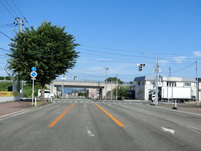 | 両側の歩道に街路樹が植えられ状態になり、緩やかな左カーブを曲がった後に仁井田跨線橋でJR奥羽本線の上を越える。跨線橋を下り切った所に側道があるが、東向き車線側の側道へ右折は禁止されていないため右折車両がいる可能性がある。 | ||