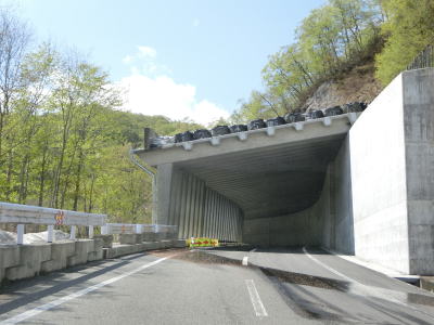 | 花山峠から2つ目と3つ目のロックシェッドをくぐるが、湯浜洞門とは異なり名称は付けられていないようである。4つ目のロックシェッドは急カーブだったが、内側の山が削られてバイパスが供用されてたため閉鎖されていた。 | ||