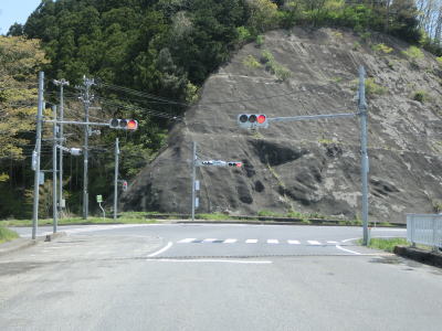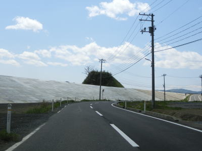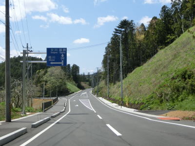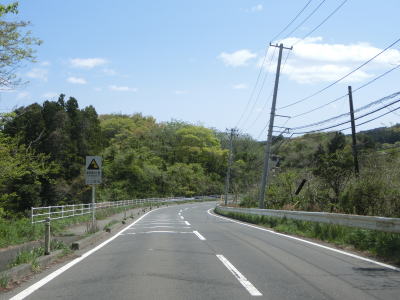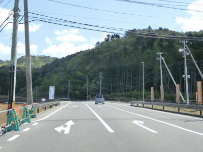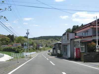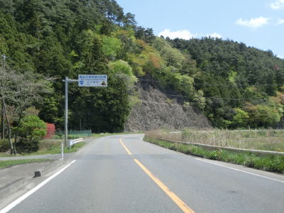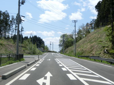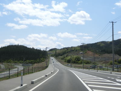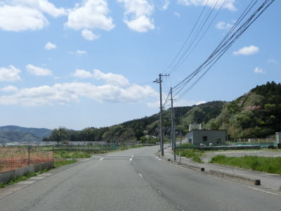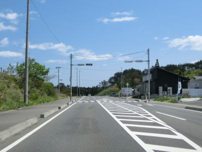 | 現道と合流して少し走ると津波浸水区間に入り、上りに転じた後に津波浸水区間から出る。標高は10m程度だが海岸線から数十メートルと近いためだろう。一部の津波浸水区間の中には家屋も建っている。津波が浸水したと言っても標高が低く家屋が基礎を残して流されたような場所もあれば床下浸水程度だった場所もあるのだろう。 | ||