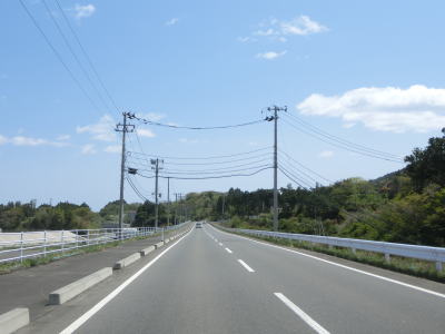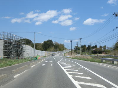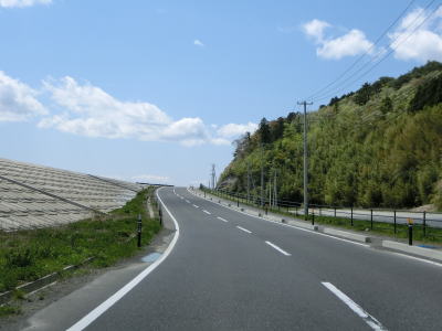 | 波伝谷漁港付近では防潮堤が建設中であった。東日本大震災から10年以上経過しているが、全ての復興事業が完了していていないようである。防潮堤よりも高く上った所で現道との交差点を通過するが、ウオッちずで国道色に塗られているものの案内標識等はなく普通に走っていればバイパスに進まされる。志津川湾越しに泊崎半島を見ながら大きく右にカーブして防潮堤よりも高い位置を走る。一旦少し下った後に現道と合流するが、こちらにも案内標識等は設置されていない。 | ||