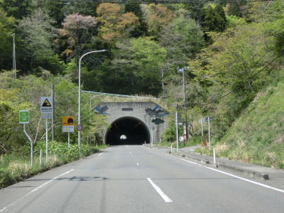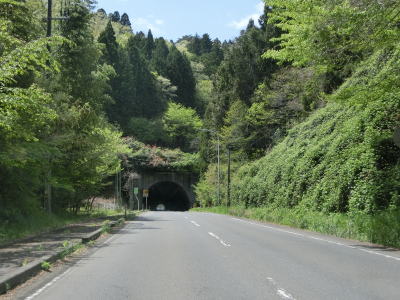 | 右にカーブしている呼沢橋を渡って少し走ると釜谷トンネルをくぐって旧河北町から旧雄勝町に入る。トンネルからは下り勾配のため程なくして過去の津波の浸水区間に入る。 | ||