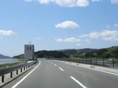 | 緩やかなS字を描きながら防潮堤の天端の高さまで上り、以降は防潮堤の上を走る。吉浜小学校跡を通り過ぎると北上川沿いとなり、防潮堤はそのまま堤防へと変わる。左側には北上川、右側には皿貝川が流れており、左右どちらも低くなっているため見通しが非常に良い。 | ||