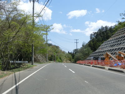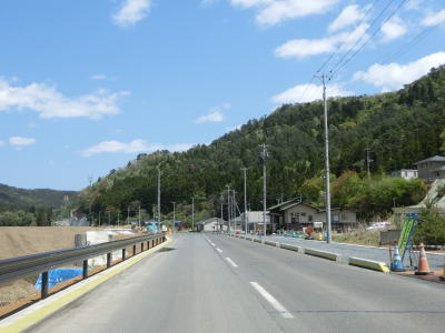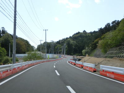 | 上り勾配となってすぐに建設中の雄勝復興バイパスの手前を左折させられた後に右にカーブして8%の急勾配を下る。いずれ旧道となる区間ながら舗装が新しいのはバイパスの建設に伴って多少改良されたためである。左カーブを曲がってバイパスと離れてからはカーブの多い2車線道路を走る。 | ||