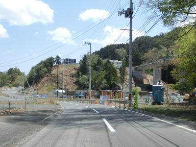 | センターラインのない1.8車線幅とやや狭い道路を下ると津波浸水区間に入る。この区間も防潮堤が造られているが、これまで見てきたものよりもかなり低い。内陸側に建設中の雄勝復興バイパスの橋梁が見えるが、津波対策として高い位置に建設されている事が分かる。 | ||
