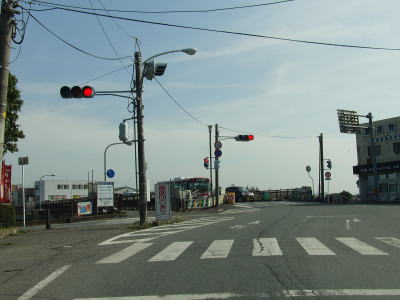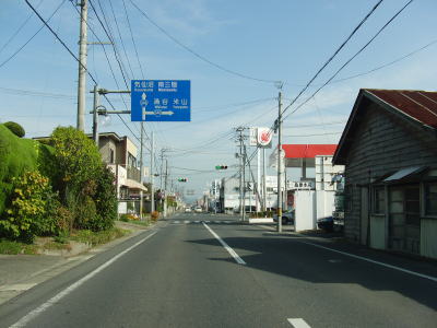 | 鉄骨だけを残す町役場建物の手前の十字路を左折して八幡川を渡る。本来なら交差点の手前に案内標識が立っているのだろうが、それも流されてしまったようで工事現場でよく見る普通の看板が立てられているだけである。背景が青で白の線で書かれているなど案内標識を意識したものではあるが小さいうえに周囲の被災状況にばかり目が行ってしまい見逃してしまうかもしれない。 ひしゃげた欄干の橋を渡って八幡川の対岸に移ってすぐにT字路に突き当たり右折する。こちらの案内標識も流されてしまっている。津波でほぼすべての家屋が流された中を走っていると約250mでR45十日町交差点に突き当たる。町の中心部で二桁国道との交差点なので本来は信号機があったのだろうが、2011年11月1日現在はR398に一旦停止の標識が立っているだけである。案内標識も流されているため青い看板で代用されている。 |