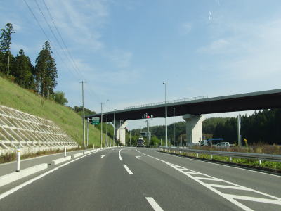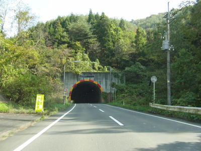 | 登米東和ICを通過して程なくしてセンターラインのない1.8車線幅になってしまうがその距離は短い。しかしながら交通量が結構多いため対向車に大型トラックがいるとそれなりの減速を余儀なくされる。僅かな狭路区間を除いて緩やかな上り勾配と緩やかなカーブの2車線快走路となっている。長閑な風景の中を走るためこの先に被災地があるとは考えにくい状況である。 朝貫田集落を抜けて少し走るとチェーン脱着場の前を通過するが、そこは旧道の入口に当たる。旧道は4輪車での通過は不可能となっているが、トンネルそのものは健在らしい。なお旧水界隧道は1886(明治19)年開通と宮城県で最も古いトンネルである。が、別段観光地化されている訳ではない。 |