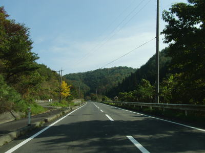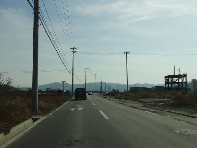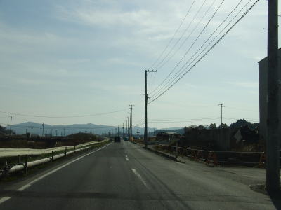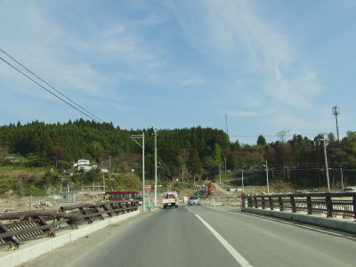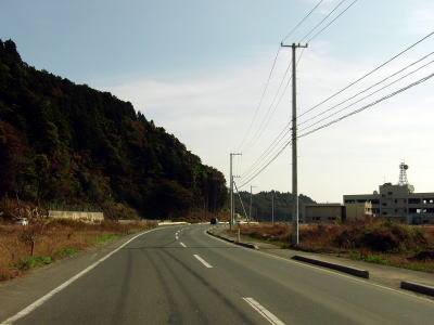 | 八幡川に沿って緩やかな勾配を下り続ける。沿線には家屋が点在しているが全壊しているものはほとんど見られない。小森集落でひん曲がったガードレールを見かける。山間部であれば積雪によるものと推測できるが、ここではそこまでの積雪があるとは思えない。となると震災によるものと思われるが、直接の原因が地震の揺れか津波かは不明である。 はっきりと津波の被害だと分かるのは南三陸町の消防署付近からである。ガードレールは大きくひしゃげており、そして何より3階建ての消防署の建物の窓ガラスが全てなくなっており津波の被害の深刻さを思わせる。道路自体は瓦礫や漂着物は撤去されており通行には支障はない。 |