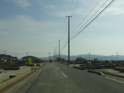 | 消防署から先は津波の被害を大きく受けた南三陸町の中心部となる。JR気仙沼線の線路をオーバーパスするが左手には八幡川に架かる鉄橋があったはずなのだが津波に流されて存在しない。この線路の真上は周りよりやや高くなっており、南三陸町の中心部を眺める事ができる。見えるのは瓦礫か骨組みだけの建物だけで改めて津波の凄まじさを感じずにはいられない。 道路に目を向けると路上の瓦礫や車両等は撤去されており通行に支障はない。栗原市などでよく見られた舗装の凹凸もほとんど見られない。アスファルトそのものは新しいものではなく震災後に舗装されたものではない事から地震の揺れの被害は少なかったのかもしれない。 |