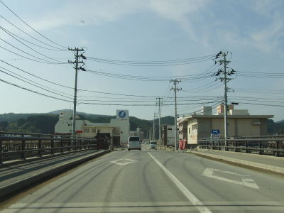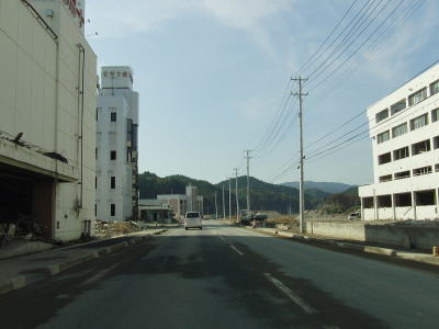 | 女川港に入るとそれまでのやや高い位置から低地に下りる。女川湾の最奥に位置する女川町中心部も津波により甚大な被害がもたらされた場所のひとつである。町の中心部は鉄筋コンクリートの建物を除いてほぼ全てが失われている。女川駅と町役場のすぐ近くでは道路そのものの損壊か復旧工事に伴うものかは不明だが、本来の国道が通れず海側に迂回しなければならなかった。その迂回路も普通の道路ではなく元々は建物が建っていたが津波で流失した跡を整地したような場所である。道幅(?)は充分に広いが本来の道路ではないため路面の凹凸が大きくかつ多いため徐行せざるを得ない。 | ||