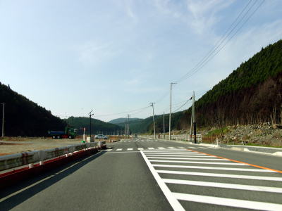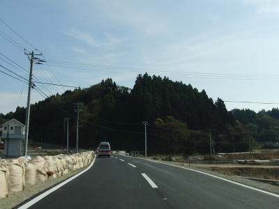 | 白浜トンネルを抜けると標高が下がり海面との高低差が小さくなる。そのため以降は津波の被災地を通る事になる。道路そのものの損壊や障害はないものの沿線の建物の大半は流失しており、跡地の中には被災車両置き場となっている場所もある。南三陸町と同様に沿岸部の集落は軒並み津波の被害を受けている。 北上川左岸を走っていると皿貝川に挟まれた堤防のような場所を走る。周囲に比べて高い位置にあるため見通しが良く、津波の被害を受けた集落や田畑が目に入る。道路そのものも被災したようだが既に仮も含めて復旧している。 |
