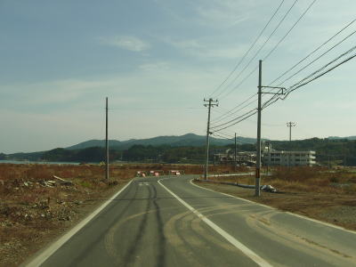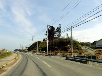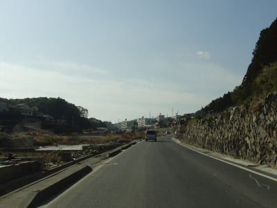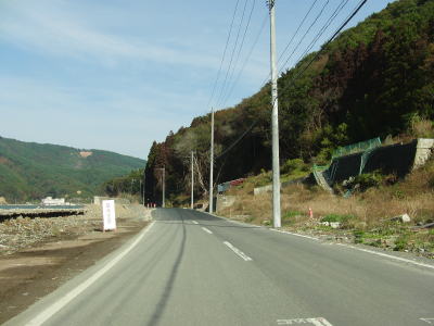 | 旧雄勝町の中心部を離れても津波の被害が甚大な地域を通る。その中でもほんの数メートル高い位置にある家屋は残っており、この僅かな差が明暗を分けてしまった。ただし、これまでと同様に津波に流されていない家屋も地震の被害を受けており無事には済んでいないものが大半である。少し湾内に入り込んだ所だが、いやだからこそ津波の被害は大きかったようで道路も損傷を受けたようで新しいアスファルトも見られる。舗装は修復されているがガードレール等は設置されていない箇所もある。 | ||