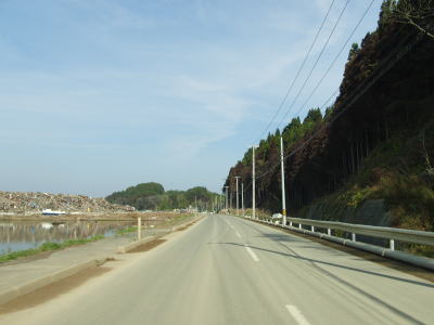 | 戸倉集落を抜けて海岸線に沿って走っているとお隣の水戸辺集落に入るが、こちらも海に面した低地のため津波の被害が著しい。水戸辺川に架かっていた橋も落橋しており仮設橋で復旧されている。水戸辺川を渡る前後で左に大きくカーブしているが、その左側は元々水田であったようでそこにはうず高い瓦礫の山ができていた。道路脇には直径10〜20cm程の塩ビの管が走っているのだが、ほぼ道路に沿って長い距離ある事を考えるとおそらくは水道ではと思われる。 | ||