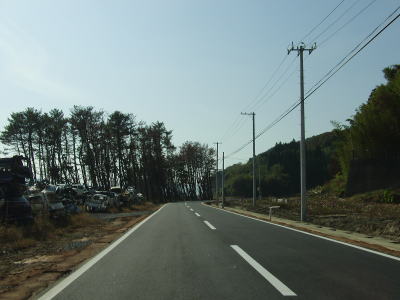 | 59.少しでも高い位置にあれば津波の被害を受けなかった様子 | 60.アスファルトが新しい | 61.石巻市に入る |