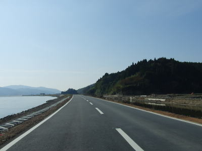 | 旧道から現道に復帰すると元の2車線道路を走る。通常であれば海が見えて気持ち良く走れると書きたいところだが時折見える津波を受けた集落を見るとそんな気分にはならない。国道自体はやや高い位置にあるため津波の被害を受けていないが、地震そのものの被害があるため路面の凹凸が多くなる。白浜トンネルが工事のため片側交互通行だったが、地震の復旧工事ではなく地震に強い水道管を敷設するための工事とのこと。これも復旧工事と言えば復旧工事なのかもしれない。 | ||