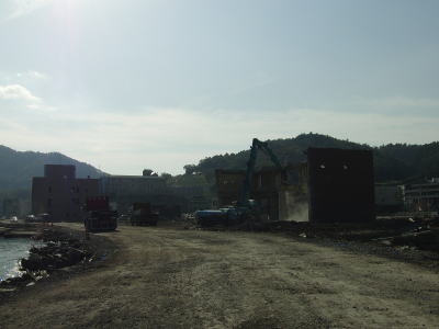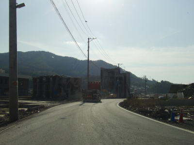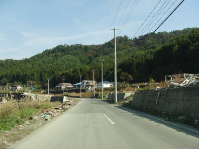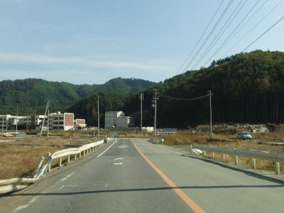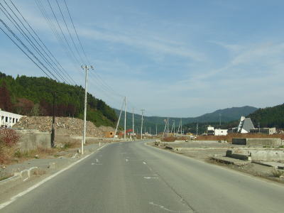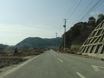 | 釜谷トンネルから平地に下りてくると津波による壊滅的被害を受けた旧雄勝町の中心部に入る。残っているのは鉄筋造りの建物か内陸もしくは高台に建っている建物のみという悲惨な状況である。宮城r192との交差点を左折してかつて町の中心部だった所を通るがその面影はない。r192交差点から約400mで宮城r238との交差点を右折する。r192、r238どちらの交差点も案内標識がおそらく流されたままで設置されていない。 | ||