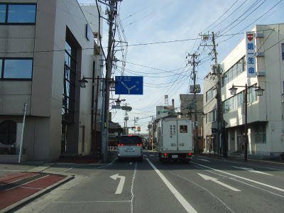 | 双葉町交差点を右折してすぐに石巻臨港貨物線のガードをくぐる。その後は旧市街地然とした風景から変わって中小のチェーン展開している商業施設が並ぶ中を走り抜ける。それらに出入りする車両が多いせいもあって交通量流れは良くない。渋滞と言える状態を走っていると双葉町交差点から約2.0kmで北上運河を渡りその直後でR45に突き当たる。右折が鋭角に交差しているためか全車両が右折禁止となっており登米方面には曲がれない。反対にR45登米方面から女川方面への左折が可能か否かは未確認である。 | ||