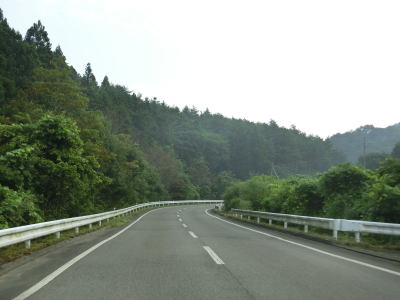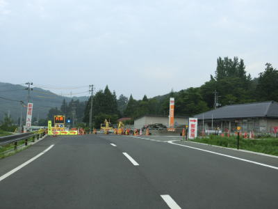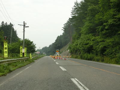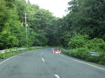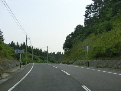 | 延長900mの登坂車線の途中に法面工事に伴う片側交互通行規制のため本線が通れなくなっていた。登坂車線が終わると同時に下り勾配となり、新田集落からはほぼ平坦な状態になる。200番台国道との重複区間ながら交通量は非常に少ない。 | ||