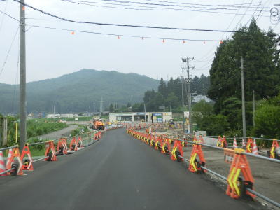 | 福島r36交差点からは新たに造られた西ノ内バイパスとなるため沿線の家屋もなく非常に走りやすい。右カーブを曲がって木戸川沿いとなった所で現道と合流するが、走行時はバイパス工事に伴って片側交互通行規制が敷かれていた。 | ||