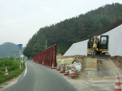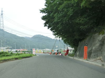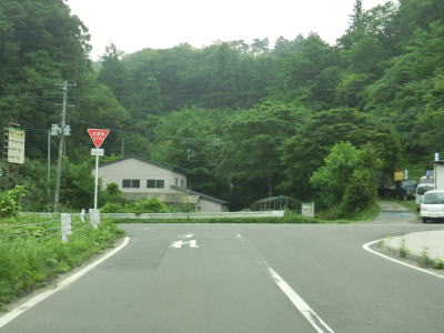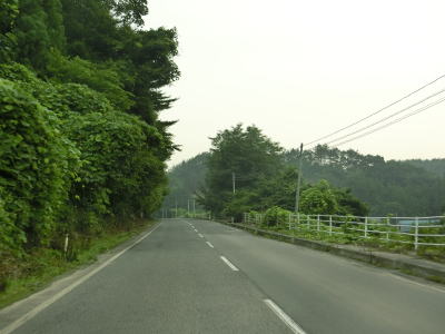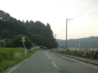 | バイパス工事現場の直後は直後は2車線道路だがすぐにセンターラインがなくなって1.8車線幅と狭くなる。木戸川に沿って走りやや急な左カーブを曲がり次の右カーブの直後にバイパスの接続予定地点を通過する。その後も1.8車線幅道路が続いているが、この区間は現道を拡幅するものと思われる。 | ||