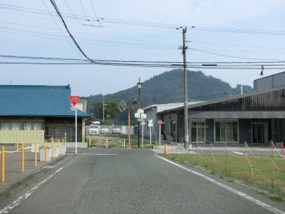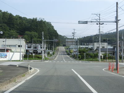 | 速度抑制のためのカラー舗装が剥がれかけて凹凸が大きくなっている急勾配を下って橋を渡ると手七郎集落に至る町道との交差点を道なりに右へと進み、次いで塩浸集落に至る町道との交差点を通過する。手七郎集落そのものが帰宅困難区域に含まれているため交差点の直後が閉鎖されている。塩浸集落に至る方は道路の端にカラーコーンが置かれているだけなので進入自体は可能である(帰宅困難区域に含まれておらず通行が可能なのか、単にカラーコーンが移動されただけなのかは不明)。 | ||