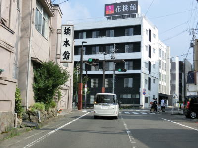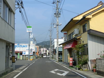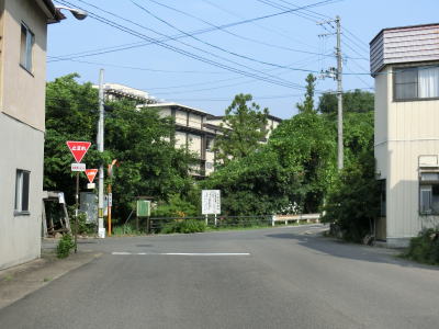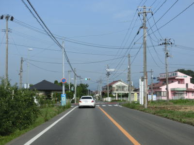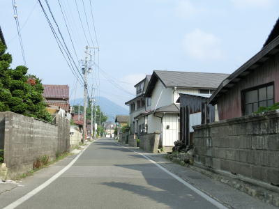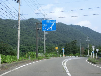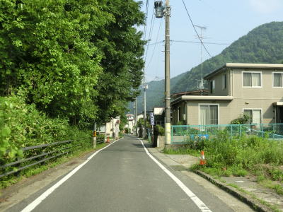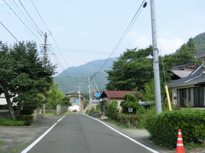 | センターラインがなくなって400m強で福島r124との交差点に突き当たり、一旦停止してから左折する。案内標識は設置されていないが、左折する角度が鈍角なのでルートミスする可能性は低いだろう。 r124交差点からも建物が建ち並ぶ間の1.5車線幅道路が続いているが、飯坂温泉に近いため一般の家屋よりも商店が多い。やや急な右カーブを曲がった直後に福島r3交差点を通過する。 |