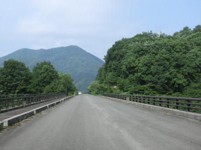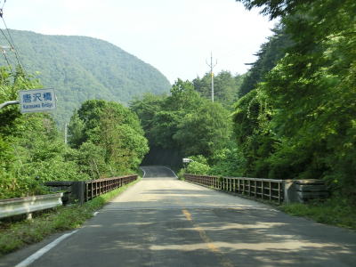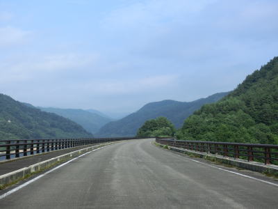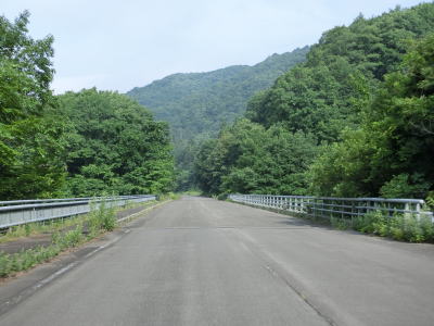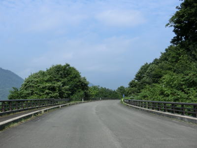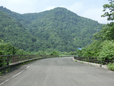 | 緩やかな左カーブを曲がった先で摺上川ダム梨平公園の出入口を通過する。その後は地蔵沢橋や稲塚沢橋、背戸ノ沢橋を渡って行く。交通量が少ないゆえに整備が行き届いていないようでセンターラインがほぼ消えかけており、橋梁部を除いて路肩から雑草が侵食しており若干道幅が狭くなっている。猿の生息域でもあるため道路を横断したり路上に居座っている姿も確認できる。 | ||