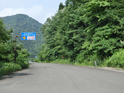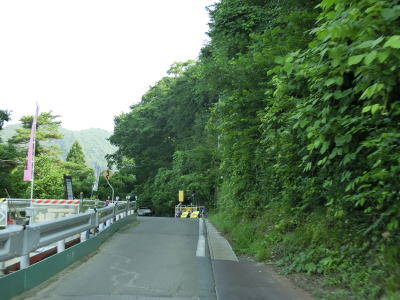 | 大型車両転回所を過ぎてすぐに狭路になる訳ではなくセンターライン付きの2車線道路が続いている。カラブ沢橋を渡り、転回所から約800m走った所でセンターラインがなくなり道幅も1.5車線幅にまで狭くなる。同時に異常気象時通行規制区間に入り、宮城県境までの1.3kmは連続雨量120mm超で通行止になる。 | ||