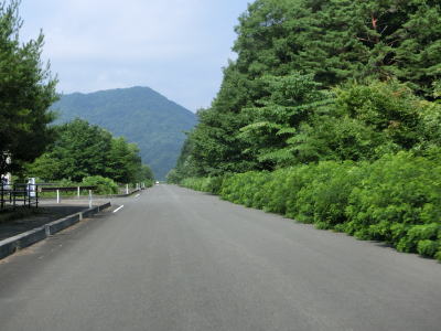 | 叶道橋、八方沢橋、奥軽井沢橋を渡って緩やかな左カーブを曲がっていると駐車桝の白線だけが描かれた駐車場の前を通る。さらに少し走ると名号の御嶽神社の前を通る。神社の近くに茂庭庵という小さな特産品販売所の建物があるが営業しているかは不明である。さらに少し先に市道(茂庭林道?)との交差点があり、茂庭っ湖の対岸に渡る橋が架けられているが、車止めが設置されているため車両で通行する事はできない。 | ||