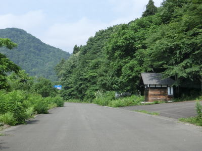 | 市道との交差点を過ぎると1km先から狭くなるため大型車の転回所がある旨の標識が設置されているのが確認できる。右カーブを曲がりながら滑沢橋を渡った先に大型車転回所がある。舗装されただけの広場でありまさに転回するためだけの場所である。前面道路及び転回所内のタイヤ痕から察するに大型車両の転回以外に使われていそうである。 | ||