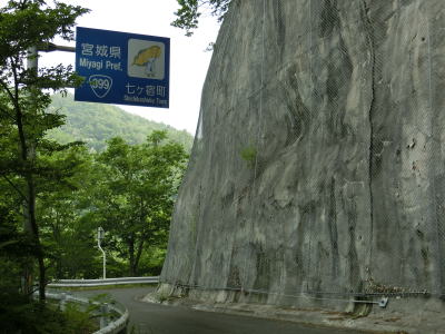 | 道幅が狭くなってから約1.4kmで宮城県七ヶ宿町に入る。ウォっちずで標示された県境と県境標識は約200m程ずれており、標識が北に位置している。宮城県に入ってからも断崖を走る1.0〜1.5車線幅狭路が続いている。勾配が緩やかな点は同じだが、急なものを含めてカーブが多い点は異なる。 | ||