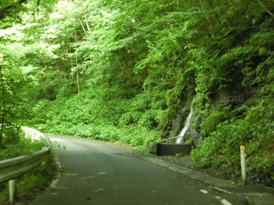 | 摺上川の谷筋を走っているものの川は全く見えない。川に流れ込む湧き水がある、汲み取り用なのかパイプが設置されておりそこからも水が流れ出ていた。水質検査結果を表示している看板等がないため飲用に適さない可能性がある。 板谷沢林道との交差点の直後に落合橋を渡ると短いながらも直線道路を走る。直線区間だけ沿線の樹木が伐採されて開けた土地に見える。その後は道幅と勾配は変わらないものの急なカーブが少なくなる。 |